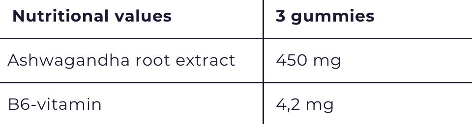 Ashwagandha-gummy met appelsmaak die hoogwaardig ashwagandha-wortelextract en vitamine B6 bevat. Ashwagandha helpt stresstolerantie en mentale balans te bevorderen en ondersteunt het in slaap vallen en de slaapkwaliteit1. Ashwagandha helpt de prestaties te verbeteren2. Veganistisch. Bevat suiker. Ingrediënten: glucosestroop, sucrose, water, ashwagandha-extract (10:1) (ashwagandha-wortelextract, maltodextrine), geleermiddel (pectine) (pectine, suiker), appelsapconcentraat, zuurteregelaar (citroenzuur), zuurteregelaar (natriumcitraat), natuurlijke smaakstof, oppervlaktebehandelingsmiddelen (carnaubawas, plantaardige olie), zwart wortelsapconcentraat, vitamine B6 (pyridoxinehydrochloride).