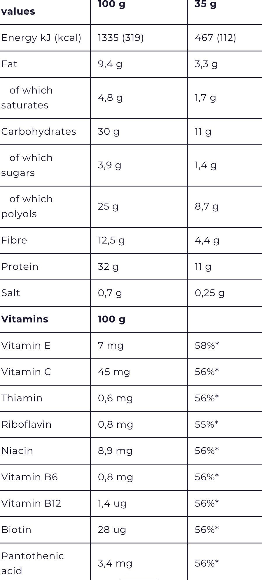 Bevat zoetstof. Ingrediënten: melkeiwit, vulstof (polydextrose), melkchocoladecoating (zoetstof [maltitol], cacaoboter, volle melkpoeder, cacaomassa, emulgator [sojalecithine], aroma), stabilisator (sorbitolsiroop), gehydrolyseerde tarwegluten, bevochtigingsmiddel (glycerol), magere cacaopoeder, zonnebloemolie, aroma, cacaomassa, maltitol, zout, emulgator (sojalecithine), vitaminen (C, E, B2, B6, B1, B12, B7, B3, B5), zoetstof (sucralose), vanille. Kan noten bevatten. Overmatig gebruik kan een laxerend effect hebben.
